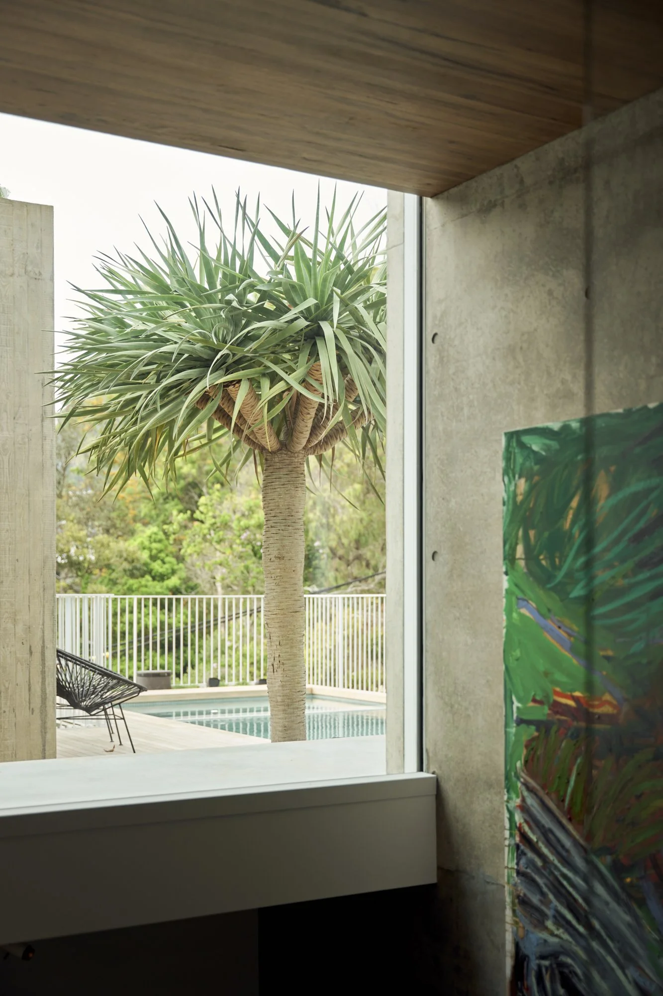 A curated collection of contemporary Australian artworks fills the home, their vibrant colours striking against the concrete walls and creating a dynamic, immersive experience.